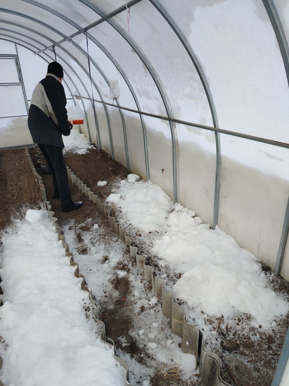 На грядки нужно внести от 30 до 50 сантиметров рыхлой снежной массы. При засыпке снег не уплотнять! Дверь в теплицу следует держать открытой, чтобы в солнечную погоду не допустить преждевременного таяния снега. В идеале он должен долежать до весны.