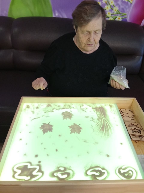 Специалист по социальной работе провела занятие рисование песком с получателями социальных услуг.