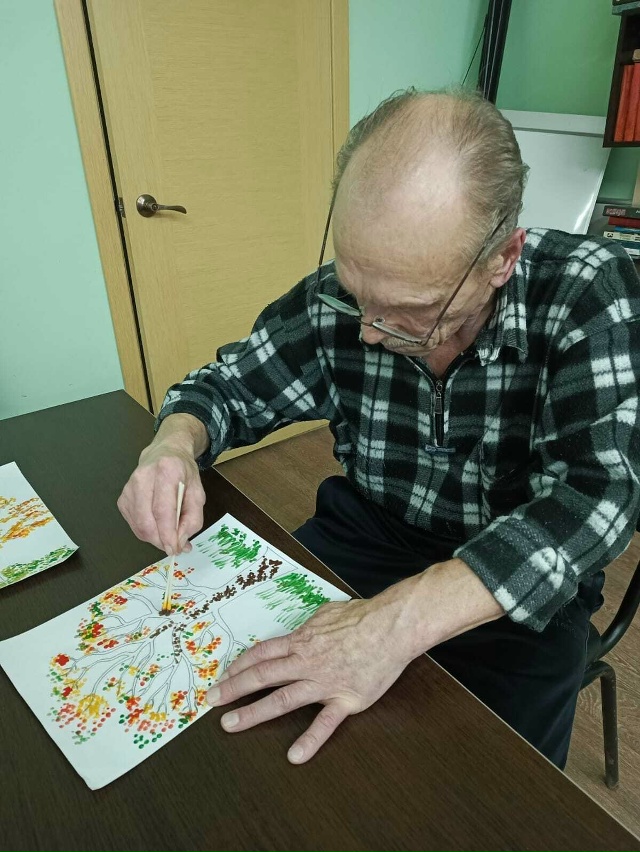 Арт-терапия – сравнительно новый метод помощи людям, основанный на позитивных эмоциях, возникающих при занятиях творчеством. .Арт-терапию используют как вспомогательный метод во время реабилитации после инфаркта или инсульта, а также иных тяжелых недугов. Она помогает стабилизировать психологическое состояние больного, раскрыть его творческий потенциал, быстрее восстановиться. Задачи арт-терапии: активизация мозговой деятельности; нейтрализация последствий стрессов и избавление от подавленности, щемящего чувства тоски и одиночества; адаптация пожилых людей к новым условиям (жизнь после инсульта или инфаркта, смена места проживания и т. д.); В дом- интернате для престарелых и инвалидов с получателями социальных услуг медицинской сестрой Кузменковой С. П проведено занятие - Арт терапия в технике "Пуантилизм" точечная живопись, рисование ватными палочками. Техника "Пуантилизм" развивает у пожилых людей : Координацию движений, точность и аккуратность; Концентрацию внимания и памяти; Воображение- простор для фантазии; Такие занятия помогают сделать жизнь пожилых яркой и насыщенной событиями.