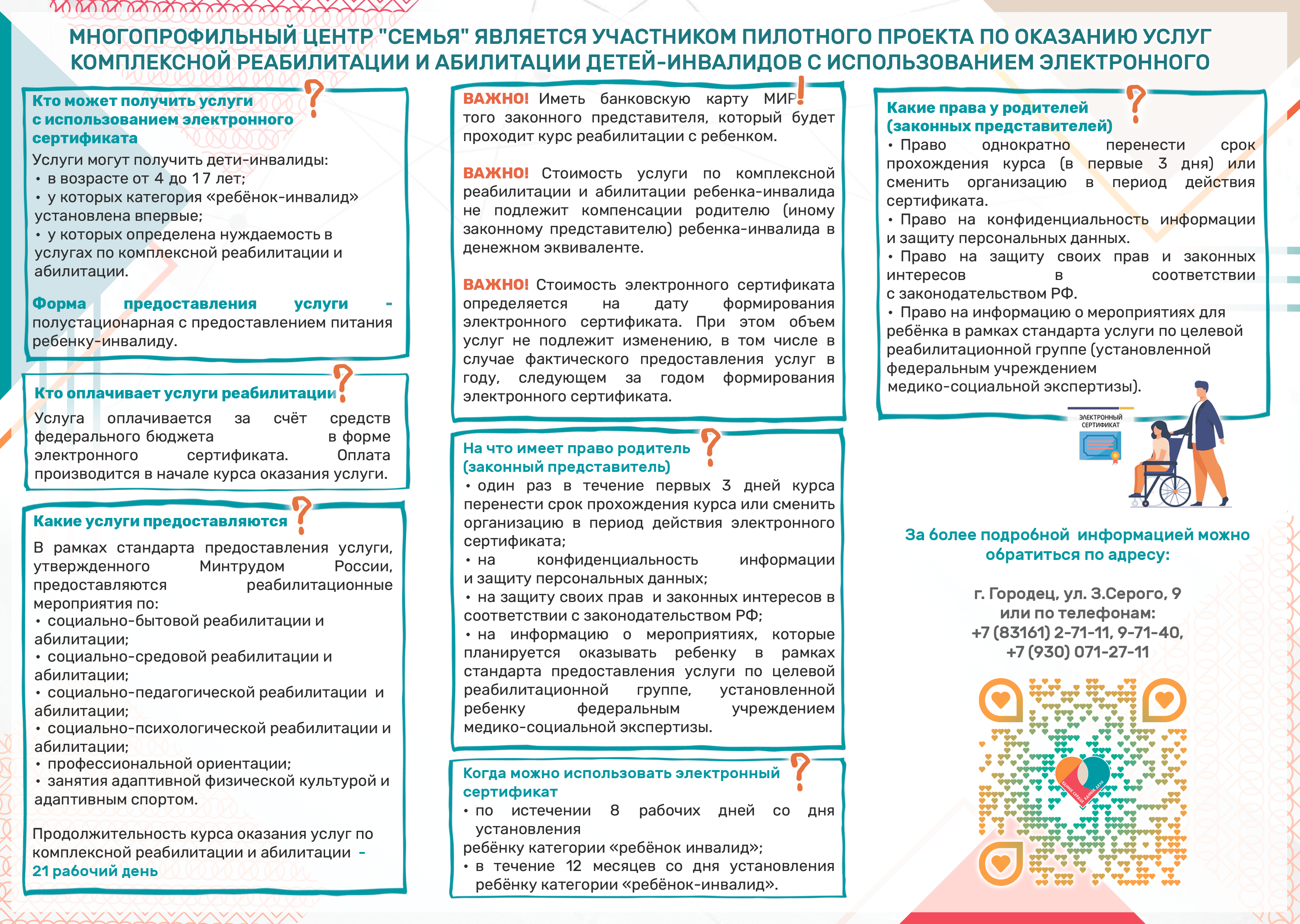 Многопрофильный центр "Семья" является участником пилотного проекта по оказанию услуг комплексной реабилитации и абилитации детей-инвалидов с использованием Электронного сертификата. С 1 января 2026 года на территории Нижегородской области запускается пилотный проект по оказанию услуг по комплексной реабилитации и абилитации детей-инвалидов. Проект реализуется в соответствии с утверждёнными стандартами предоставления услуг.