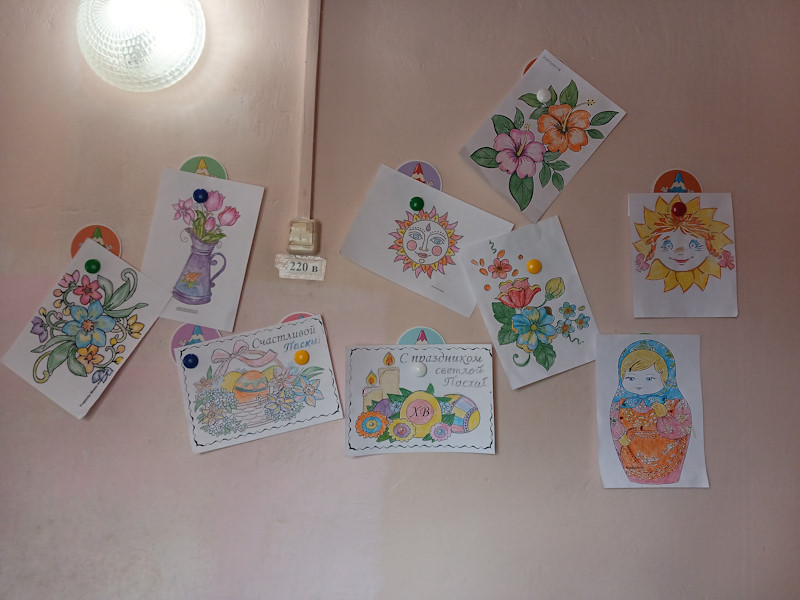 Жители Богородского дома-интерната готовились к встрече со Светлым Православным Праздником Пасхи! Конечно же они постарались и разукрасили рисунки к этому дню, украсили ими помещение.