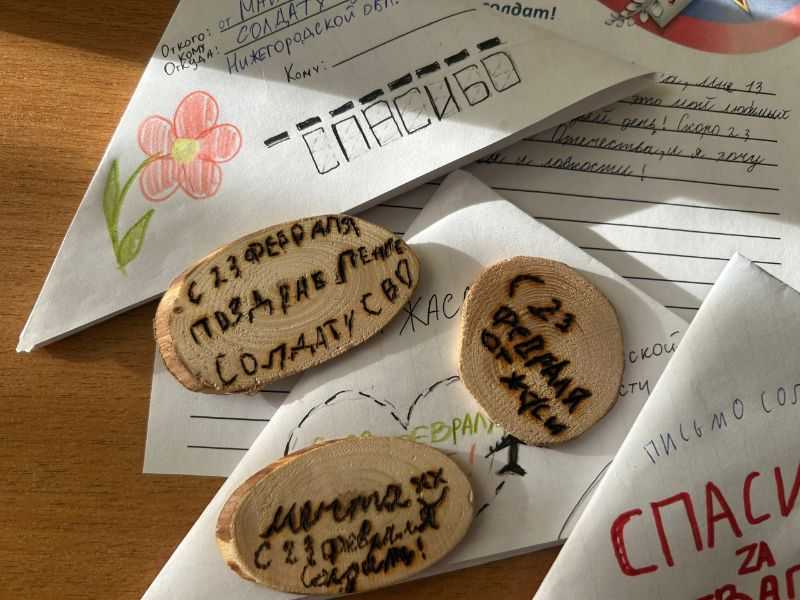 В качестве сувенира вместе с письмом ребята отправили нашим защитникам медальки с посланием, выполненные в технике пирографии (выжигания по дереву).