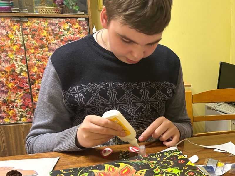 Воспитанники стационарного отделения с удовольствием создают декоративные картины с использованием шишек, рябины и листьев на занятиях трудотерапии