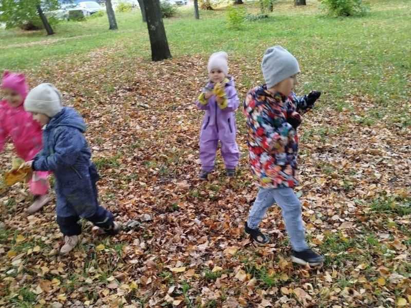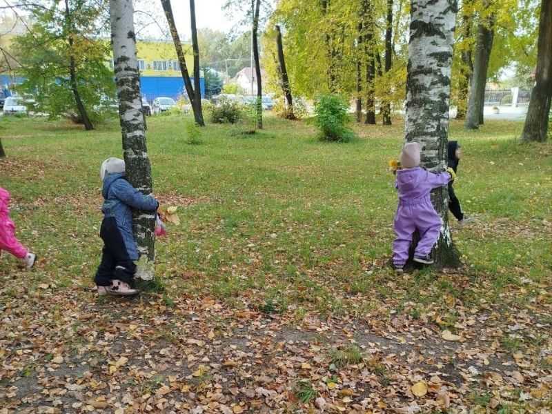 Дети с интересом наблюдали и рассматривали листочки на деревьях, собирали красивый осенний букет из листьев, играли в игру "Найди берёзку", с удовольствием побегали на свежем воздухе.