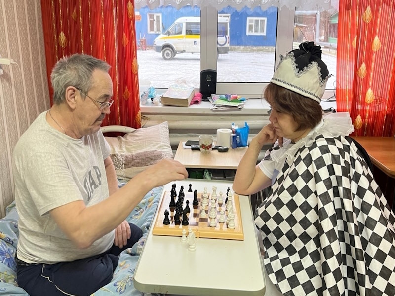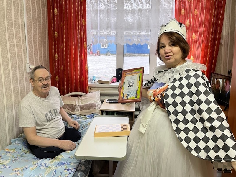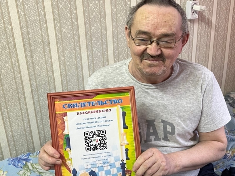 Руководитель шахматного кружка МДОУ "Детский сад №4 "Родничок" посетила Тоншаевский дом - интернат для престарелых и инвалидов и провела Акцию "Шахматный десант добра". В акция принял участие Лебедев Николай Леонидович и выиграл не одну игру у "шахматной королевы", за что был награждён свидетельством шахматиста.
