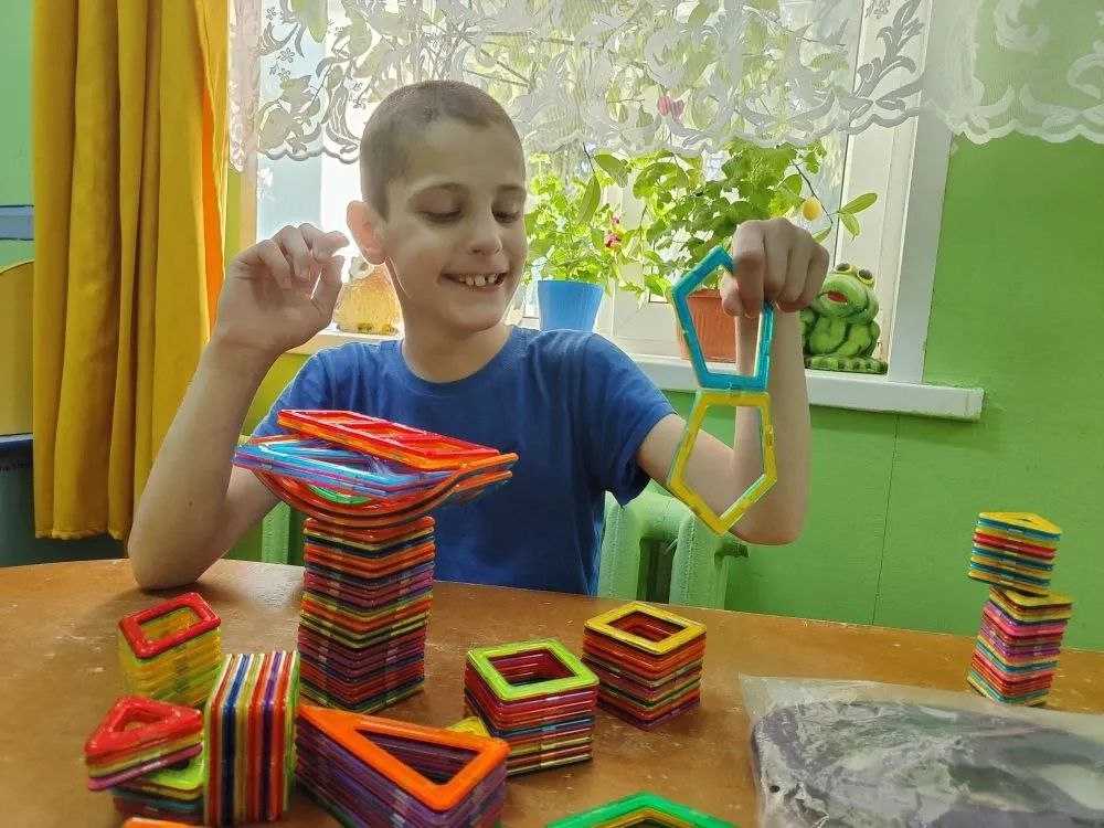 Собирает магнитный конструктор и с искренней увлеченностью погружается в мир своих фантазий.