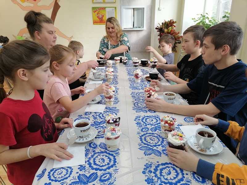 Каждый ребенок проявил фантазию в изготовлении своего трайфла, используя бисквит, сливочный крем, ягодные начинки и съедобные кондитерские украшения. Десерты получились яркие и неповторимые. И, конечно, всем очень хотелось попробовать, какие они на вкус. Вместе дружно накрыли стол, приготовили чай и в такой теплой атмосфере с большим удовольствием лакомились пирожными собственного приготовления. Результат превзошел ожидания – это было о-о-очень вкусно.