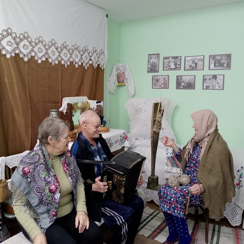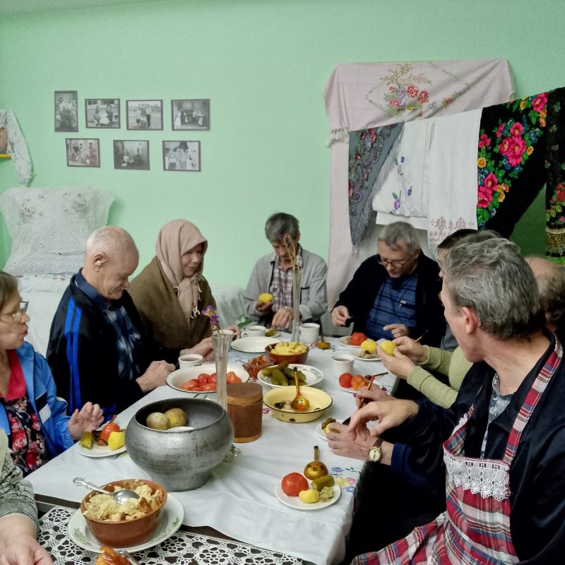 В рамках декады пожилого человека в библиотеке дом –интернате организовано путешествие в прошлое, в котором жители оказались на «Деревенских посиделках» где жители смогли прикоснуться к быту, традициям и духу русской старины в горнице, где встретили их хозяйка горницы со словами: «Добро пожаловать, гости званые и желанные! Всех в нашу избу приглашаем, душевного встречаем!». С порога чувствовалось — празднику быть! Программа началась с разговора о важности сохранения культурных корней. А дальше началось самое интересное: жители шагнули в воссозданную русскую избу, где каждый уголок дышал историей. Гостей встретили домотканые половики, кружевные салфетки, вышитые рушники с замысловатыми узорами. Кровать с подзором, прялка, рубель для глажки белья, прялка — здесь можно было рассмотреть вблизи, потрогать и даже попробовать использовать. Но «посиделки» не ограничились экскурсом в быт. В старые времена был такой обычай у русских людей: как заканчивали полевые работы, собирали урожай, а хлеб в закрома засыпали, коротали осенние да зимние вечера вместе, устраивали посиделки. Как говорится в русской пословице, «от скуки бери дело в руки». А потом спешили разгадать непростые загадки (загадки присутствовали на всех вечеринках, празднествах, посиделках, люди любили складывать и отгадывать их) о бытовых предметах, которыми пользовались и находили эти предметы в горнице. Затем ведущая посиделок рассказала о капустнике, который предки уважали и почитали. Сам овощ является богатым источником витаминов. Хозяйки приглашали к себе соседок и подружек помочь нарубить капусты на зиму. Отказаться от приглашения считалось знаком неуважения к хозяевам. Так и ходили нарядные девушки из дома в дом с песнями, шутками, прибаутками, помогая друг другу в заготовке капусты. Не одно трапеза не проходит без этого уникального блюда , из квашеной капусты можно приготовить множество полезных и сытных блюд. Следуя давней традиции, мы решили заквасить капусту. ?? Жительница дома-интерната Татьяна Алексеевна рассказала и показала, как правильно рубить и солить капусту на зиму. Засолили капусту по старинному рецепту который в ее семье передавался из поколения в поколение и практически не изменился до наших дней. А за соседним столом капусту солили при помощи пальчиковой гимнастики проведенной медицинской сестрой Кузменковой С.П. Дружно, с огоньком и задором исполняли частушки, соревновались на знания пословиц и поговорок., как говорят, соловья баснями не кормят, а на тощак и песня не поется. Настало время переходить к застолью. А на столах — будто скатерть-самобранку расстелили: картошка в чугунке, каша и лапшевник в глинянной посуде, чай с вареньем приготовленном из ягод и яблок из своего сада. Организованные деревенские посиделки, окунули жителей, будто в старину. Они поиграли, повеселились, вспомнили известные традиции Ведь недаром, же говорится: Чем дальше в будущее входим, Тем дольше прошлым дорожим