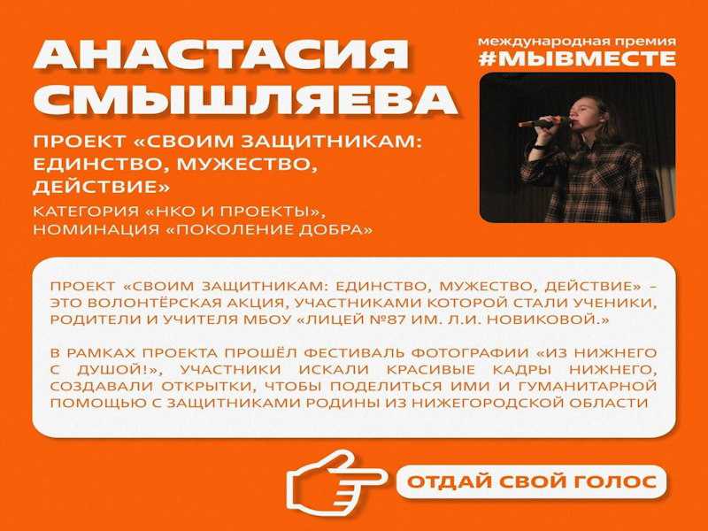 Анастасию Смышляеву с проектом «СВОим Защитникам: единство, мужество, действие» (категория «НКО и проекты», номинация «Поколение добра»).