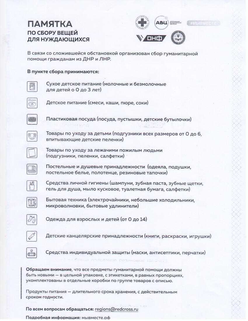 По поручению Управления Президента Российской Федерации по общественным проектам информируем о сборе гуманитарной помощи гражданам, вынужденно покинувшим, а также освобожденным с территорий Донецкой и Луганской Народных Республик в региональных отделениях Общероссийской общественной организации «Российский Красный Крест» (памятка прилагается) по адресу: г. Нижний Новгород, ул. Б. Покровская, 27.(Гриневич Тамара Васильевна), адрес электронной почты: 52region@redcross.ru
