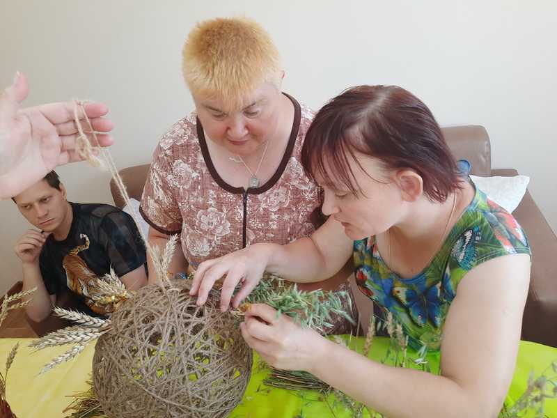 Затем участники занятия приступили к изготовлению поделки из веточек овса и пшеницы. Они формировали красивые мини-букеты и оформляли ими необычную сферу из шпагата, таким образом получилась необычная и красивая вещица для декора.