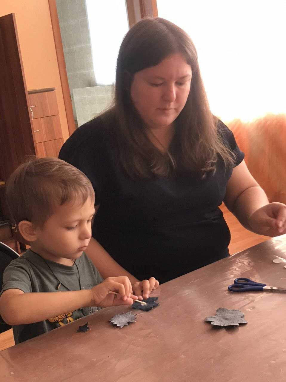 На начальном этапе ребята выбрали заготовки будущего цветка и с помощью ножниц придали лепесткам нужную форму. Затем с помощью клея начали сборку цветка - от большей части к меньшей. По окончании работы добавили декор в виде цветной пуговицы.