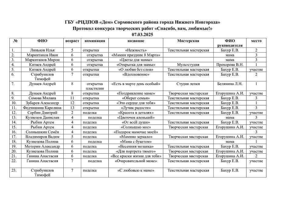 Подведены итоги творческого конкурса "Спасибо Вам, любимые!", приуроченного к 8 Марта. На конкурс было подано 38 работ в трёх номинациях: Поделка; Открытка; Рисунок. Творческие работы оценивались конкурсной комиссией в соответствии с критериями, заявленными в Положении о Конкурсе.