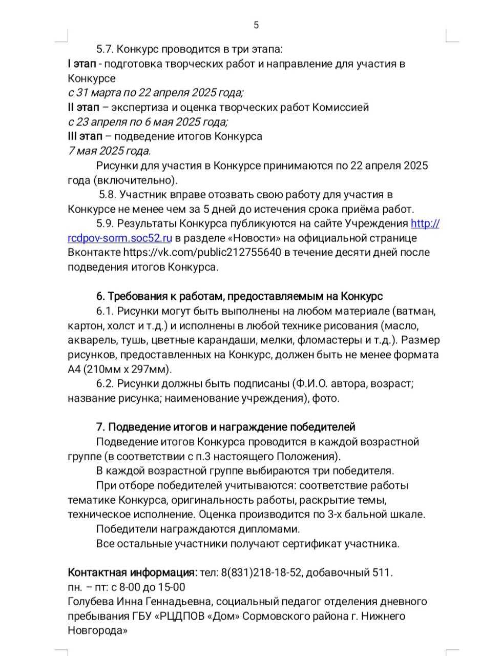 Конкурс проводится в несколько этапов: 1 этап - подготовка творческих работ и направление для участия в Конкурсе с 31 марта по 22 апреля 2025 года; 2 этап - экспертиза и оценка творческих работ Комиссией с 23 апреля по 6 мая 2025 года; 3 этап - подведение итогов Конкурса 7 мая 2025 года.
