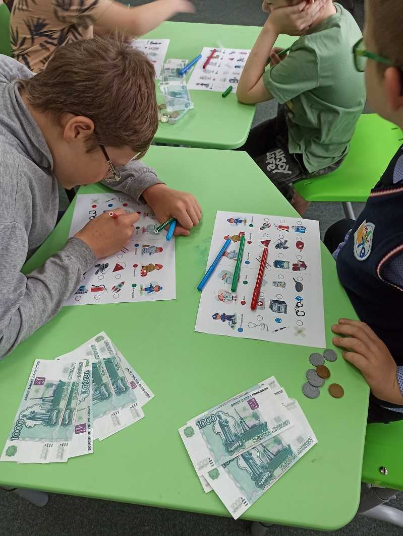 Сегодня в Мультстудии состоялось занятие по формированию основ финансовой грамотности у детей. На первом этапе урока участникам была предложена презентация "Где живут деньги", в которой были рассмотрены все варианты хранения денег. Также ребята поговорили о том, что такое деньги, какие они бывают, о бережном отношении к деньгам. На втором этапе рассмотрели вопрос откуда берутся в семье деньги и почему взрослые работают. Ребята поговорили о знакомых профессиях и об особенностях каждой профессии. В заключении каждый участник получил карточку с изображением людей разных профессий и предметов. Ребятам предстояло определить какой предмет относится к той или иной профессии и обозначить их разным цветом. Каждый цвет соответствовал определенной профессии.