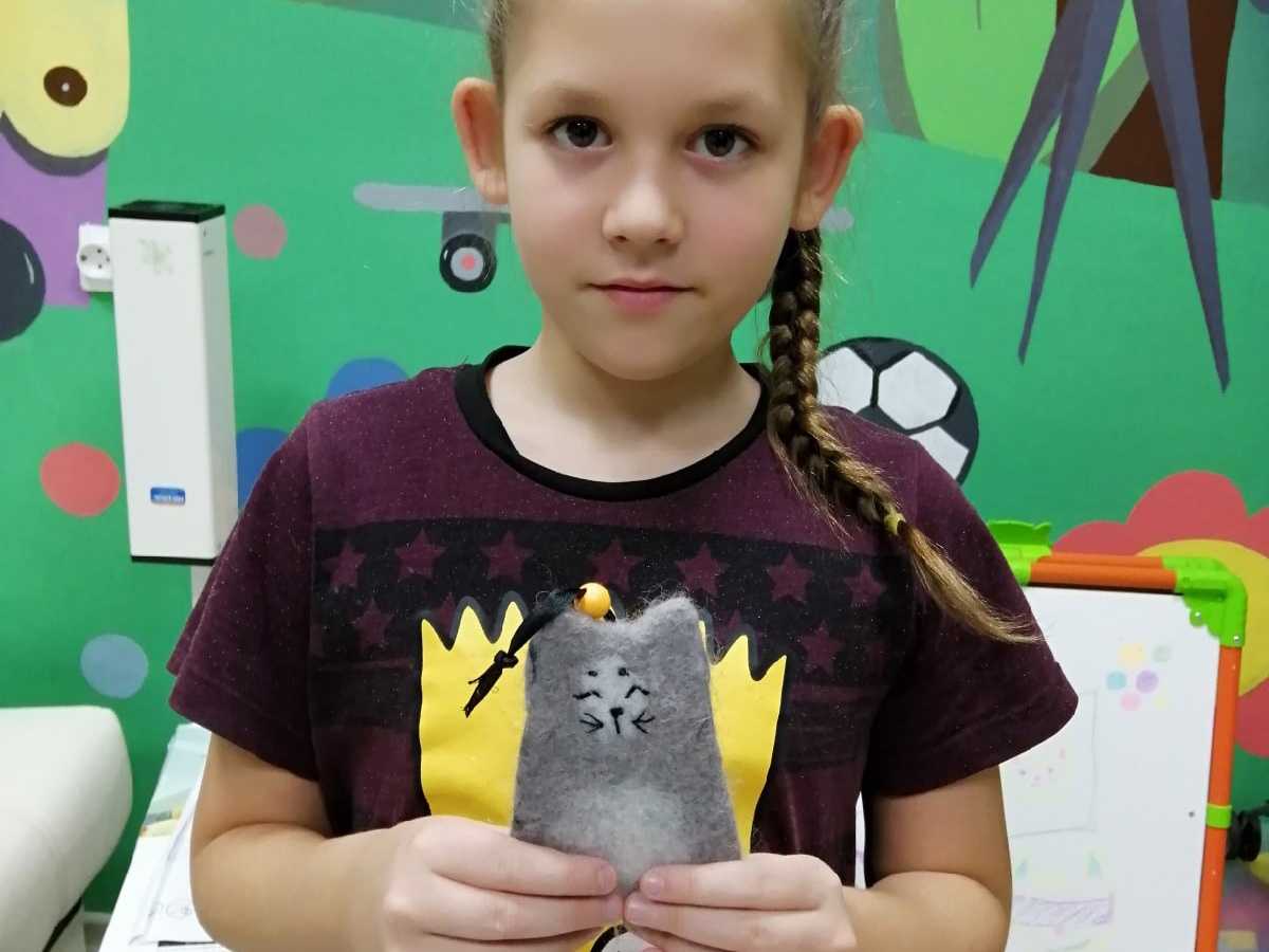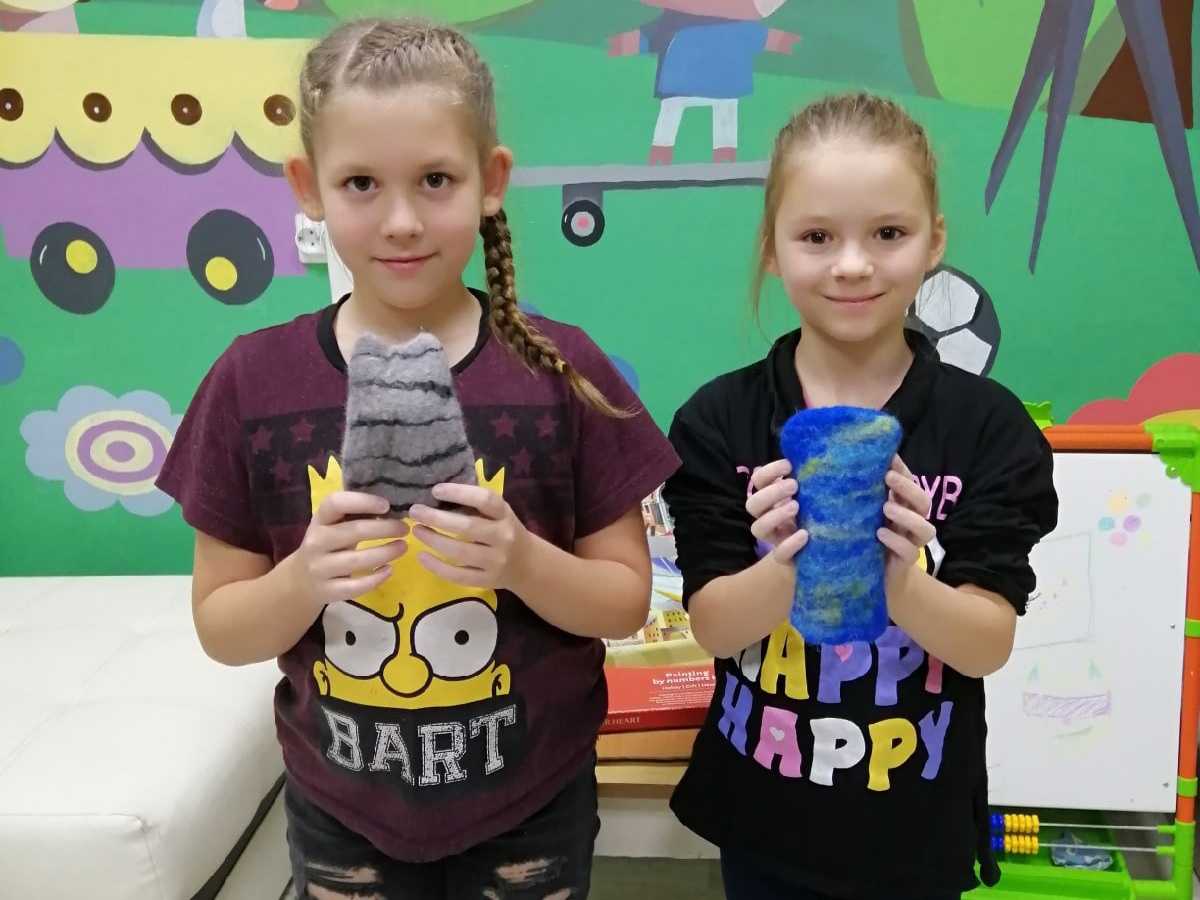 Виктория рисует картину. Алина и Ксюша занимаются мокрым валянием, делают подарки для папы.