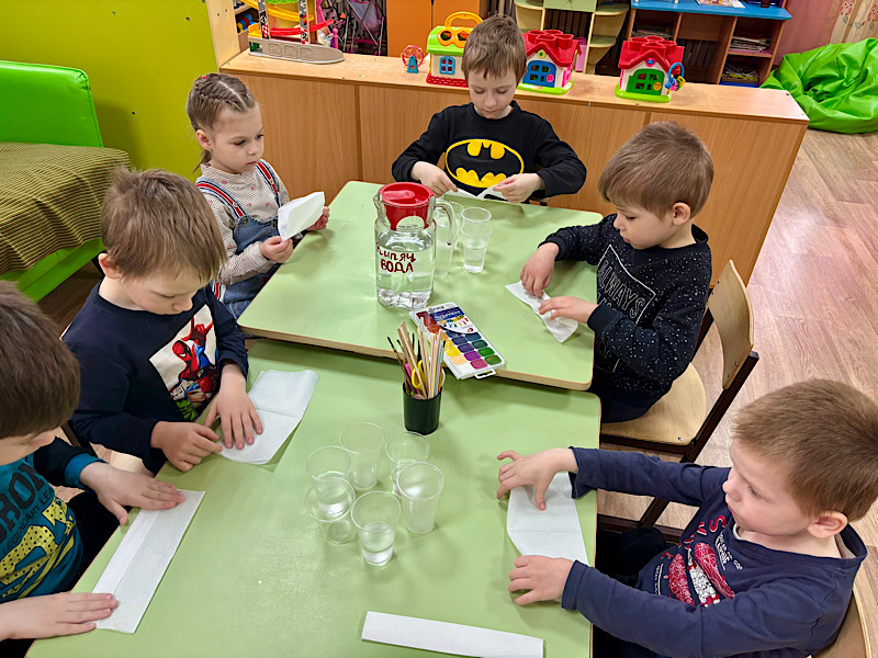 Вместе с воспитателем Борисовой Валентиной Викторовной ребята усвоили ключевые характеристики воды: её прозрачность, отсутствие запаха, способность принимать форму ёмкости, текучесть, растворяющие свойства, а также возможность замерзать и менять цвет. В ходе опыта "Шагающая вода" ребята наблюдали, как вода поднимается по салфеткам, смешивая соседние цвета и образуя новые.