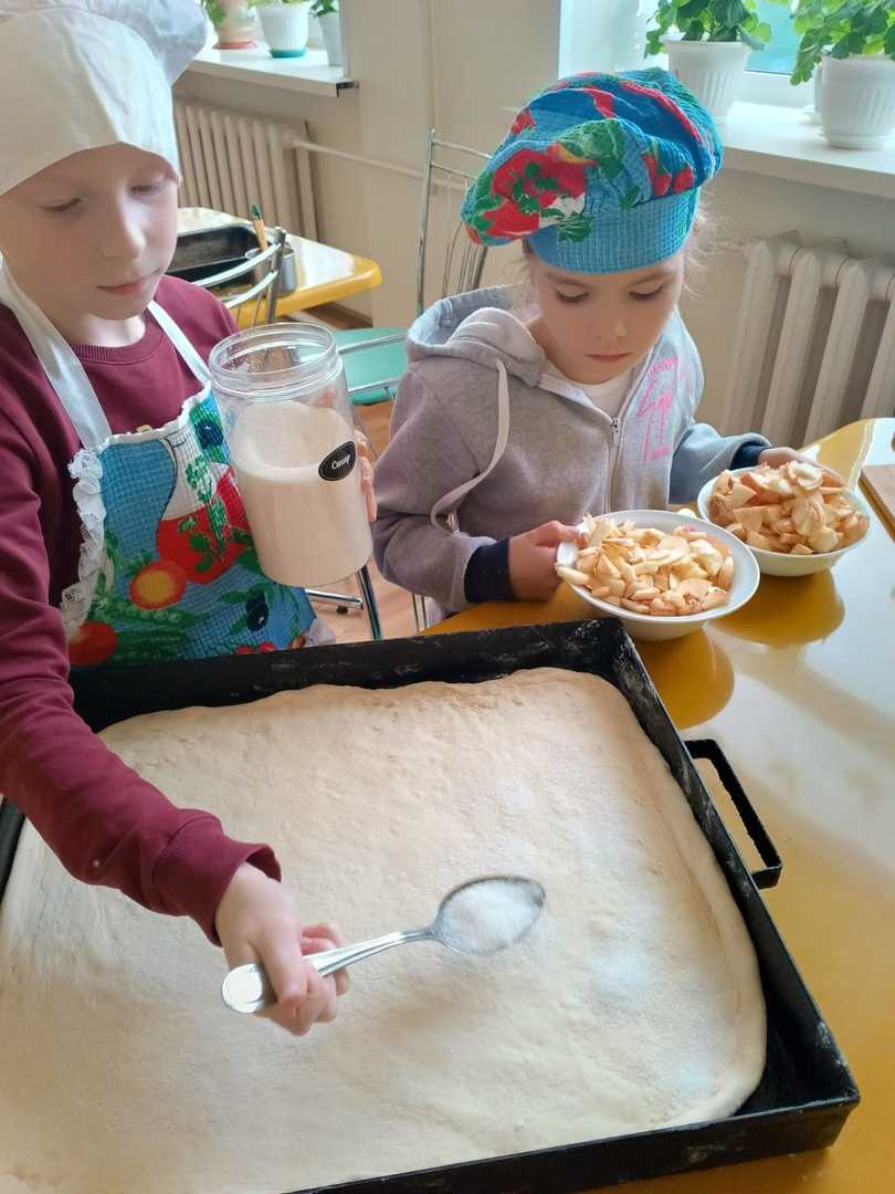 Ребята замесили тесто, порезали яблочки, положили песочку и отправился наш пирог в духовку. К столу, заварили полезный чай с имбирем и лимоном, порезали наш вкуснейший яблочный пирог.