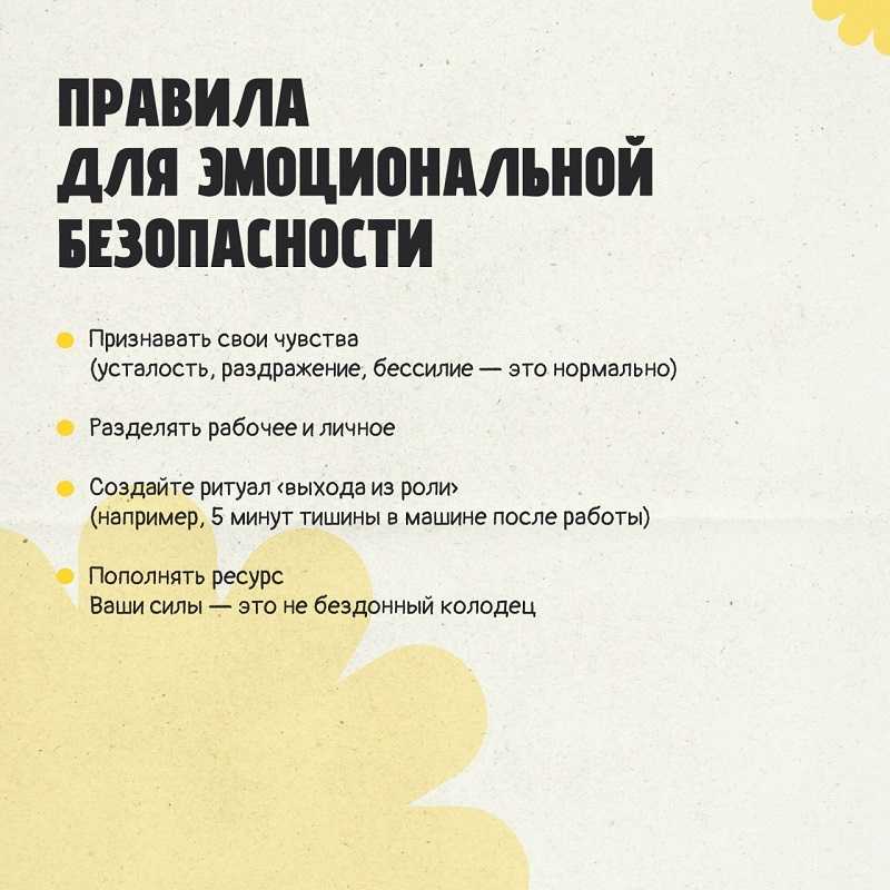 Инструкция по сохранению себя в профессии. В карточках информация не только о техниках скорой помощи в моменты стресса, но и правила долгосрочной эмоциональной гигиены.
