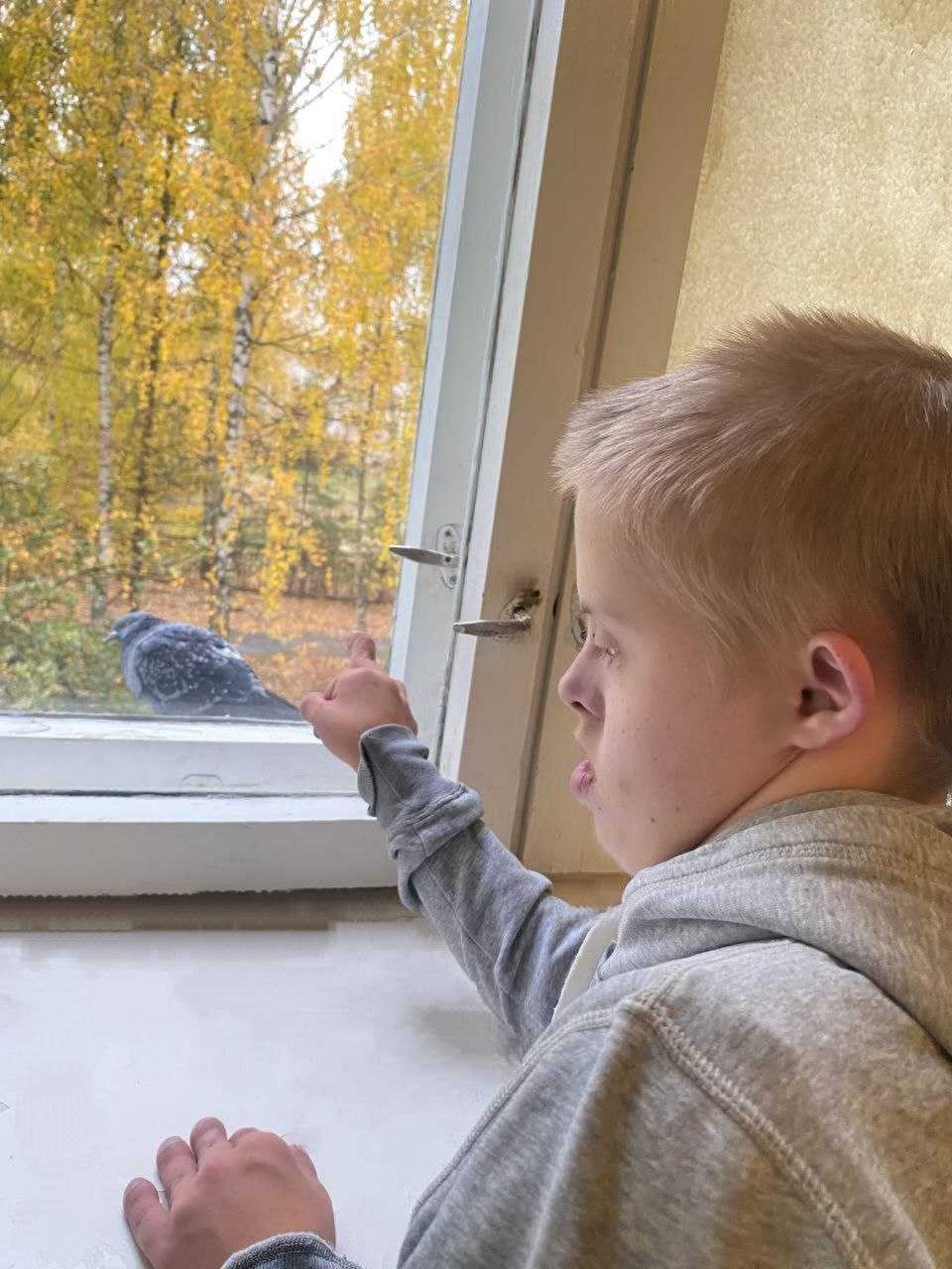 В осенний день Андрюша любуется красотой берез, окрашенных желтыми листьями, а шустрые голуби прилетели к нему на окошко.? Очень нравится Андрюше наблюдать за голубями.?