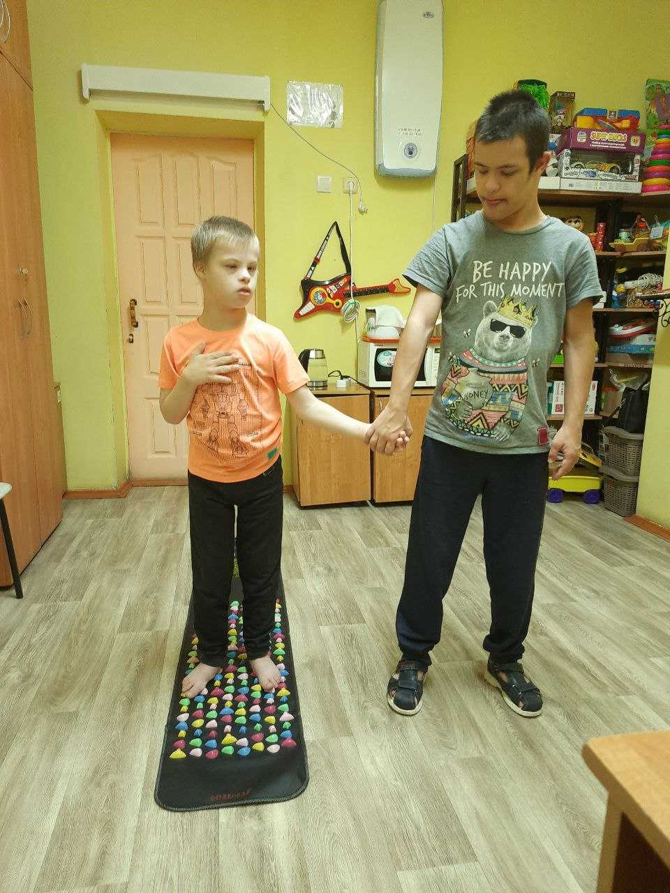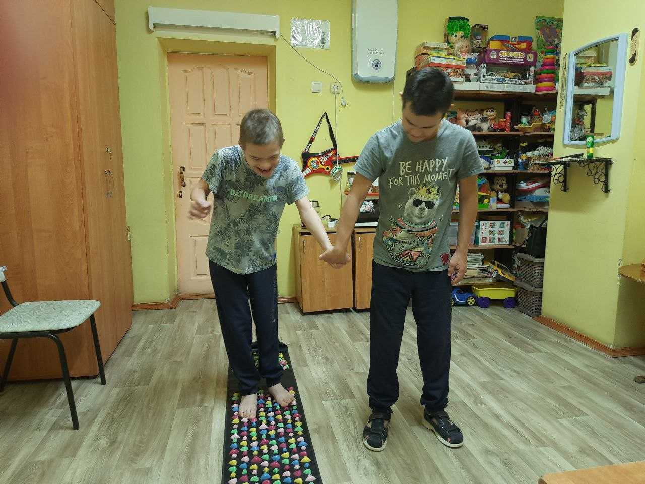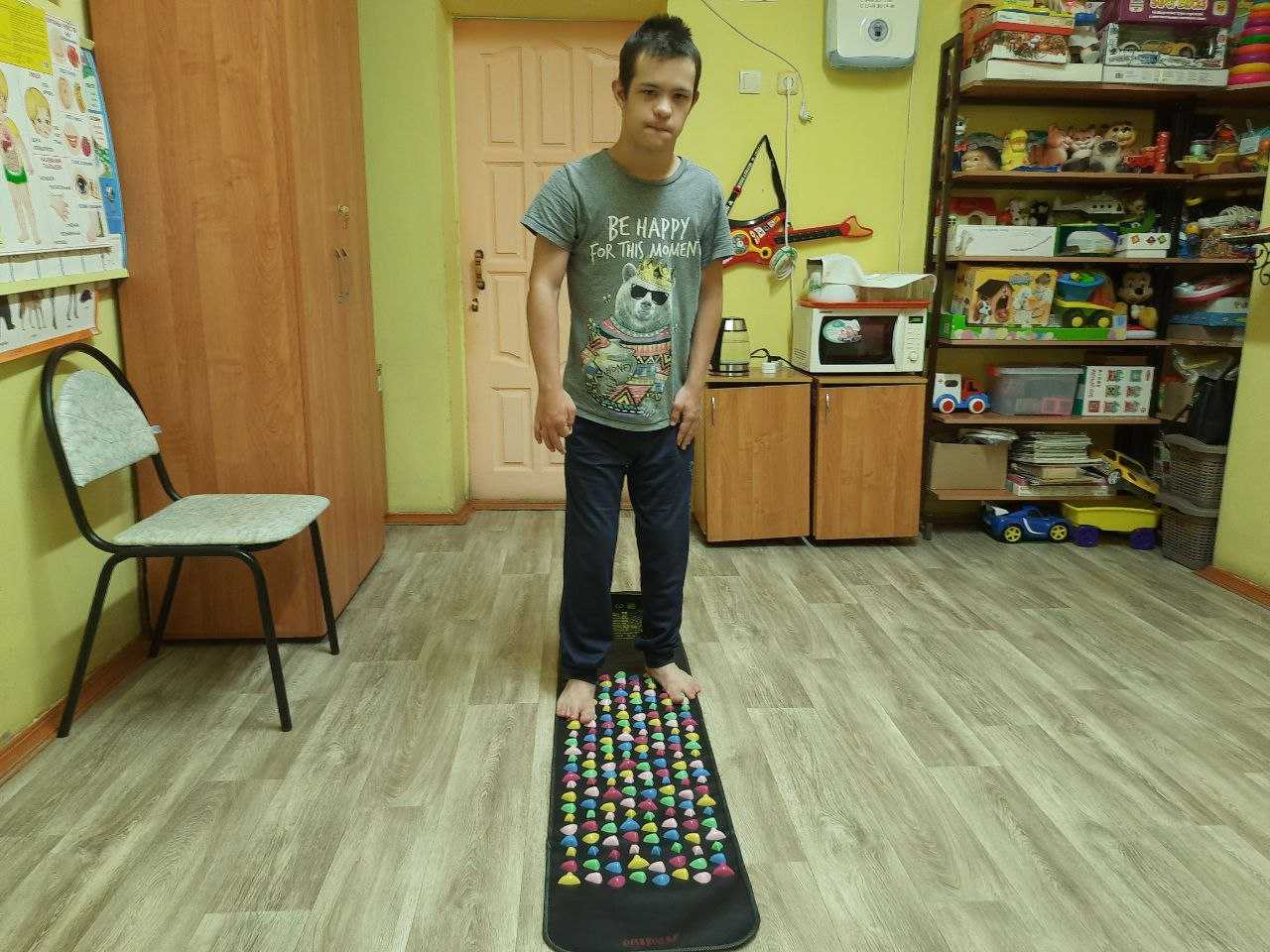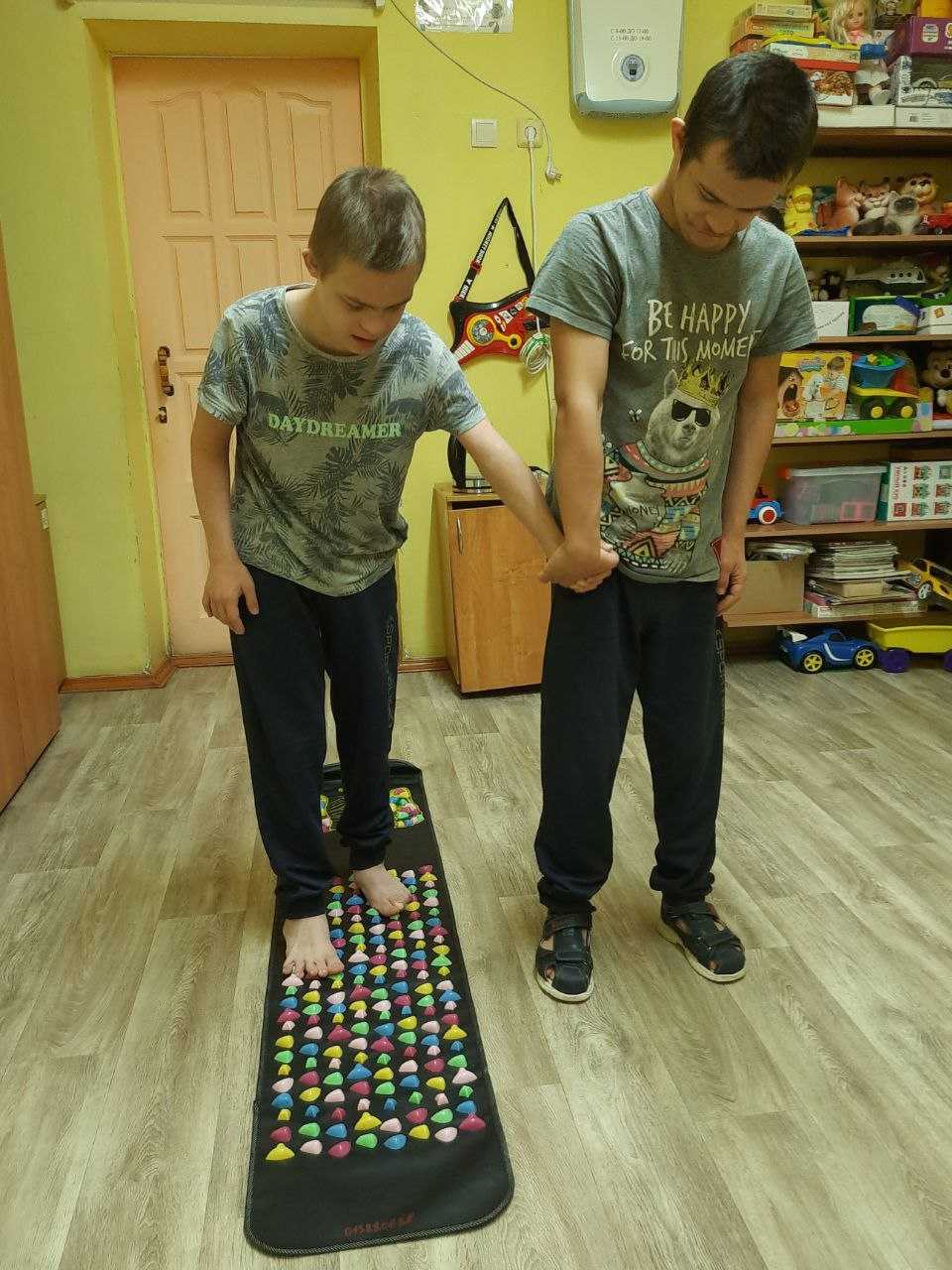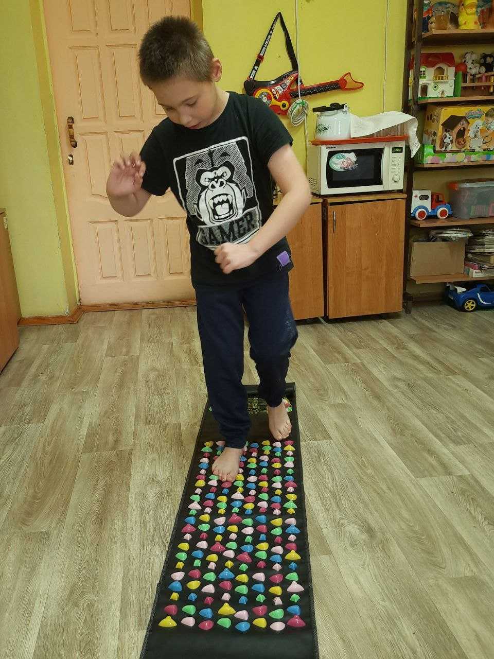 Ребята с удовольствием прошлись по ней босиком. Всем было интересно, как камешки перекатывались и массировали им ножки, ведь это не просто дорожка, а массажер. Теперь мы постоянно будем пользоваться массажным ковриком, улучшая при этом свое самочувствие.