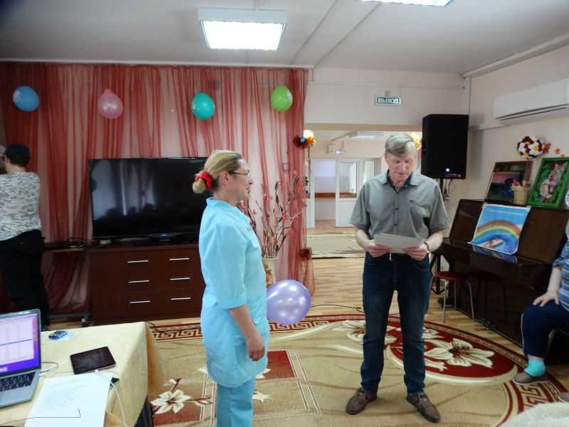 Наш коллектив также приехали поздравить с праздником вокальная группа «Радость». В красивых костюмах, веселые и задорные они исполнили народные, лирические, современные музыкальные произведения. Они от всей души пожелали крепкого здоровья, семейного счастья, успешной работы на благо жителей интерната! Пусть наградой за нелегкий труд станут добрые слова и благодарные улыбки!
