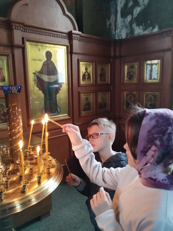 Глаза ребят светились любопытством, пока они изучали внутреннее убранство — золотые оклады икон, старинные фрески, теплый свет свечей. Каждый уголок храма привлекал их внимание и вызывал тихие вопросы: «Что это?», «Зачем это здесь?».