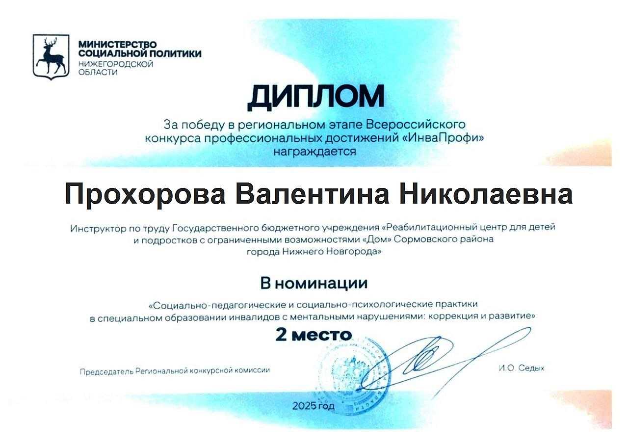 Поздравляем Валентину Николаевну Прохорову, занявшую почетное второе место в региональном этапе Всероссийского конкурса профессиональных достижений ИнваПрофи! Конкурс проводился в 2025 году, и вот заслуженная награда нашла своего героя!