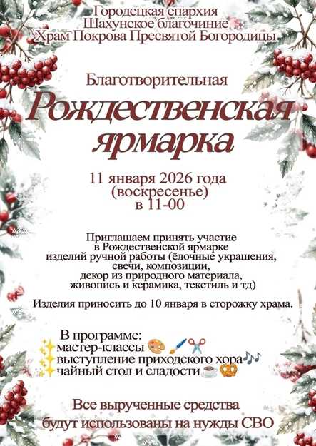Приход храма Покрова Пресвятой Богородицы Шахунское благочиние приглашает всех желающих принять участие в Благотворительной Рождественской ярмарке