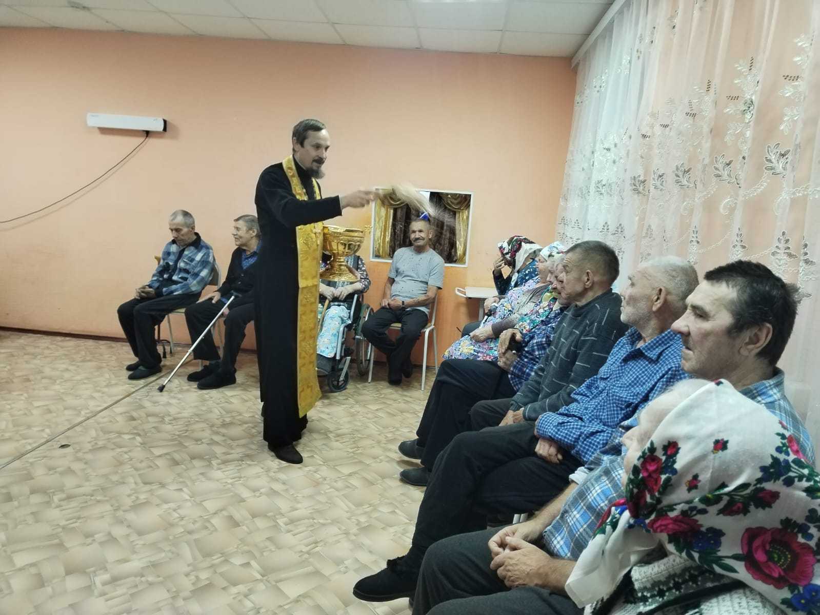 Также отец Антоний поздравил всех присутствующих с днем Покрова Пресвятой Богородицы, благословляя святой водой и пожелав здоровья и благодати Божьей. Эта встреча подчеркнула тесную связь поколений, укрепила дух и внесла особую нотку света и доброты в жизнь наших проживающих. В поздравительном слове отец Антоний пожелал всем нести радость окружающим, стремиться к миру, любви и радости общения друг с другом и Богом и окропил всех святой водой.