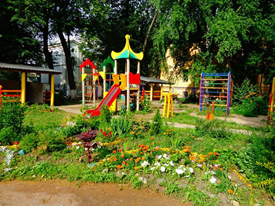 На участке для прогулок расположены три веранды с навесами и скамейками, две горки, две песочницы, спортивное оборудование: турник трехуровневый, шведская стенка, тренажеры, качели, спортивный комплекс, территория благоустроена скамейками, клумбами, вазонами, многолетними зелеными насаждениями (ели, туи, кустарники, цветами и т.п.) на площадках травяной газон, дорожки и тротуары имеют асфальтное покрытие, под спортивным оборудованием цветное покрытие из прорезиненной крошки, под качелями армированный газон.